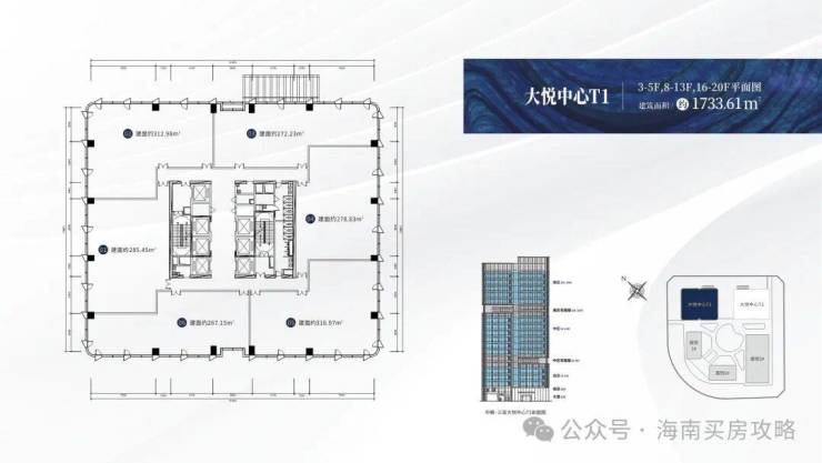 【楼栋概况】:🔍大悦中心T1,城市之光,高度88米,共20层,总建筑面积约3万㎡,在售户型建面约:267-316㎡,6梯6户,标准层高约4.2米。