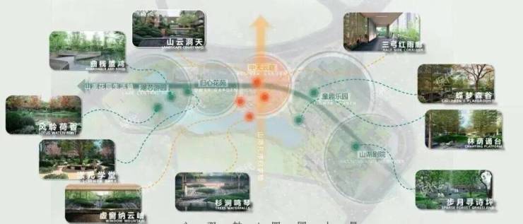 小区内部:项目汲取余荫山房造园理念,采用“缩龙成寸”的设计方式,以水居中,环水建园,打造了「辰园十景」。