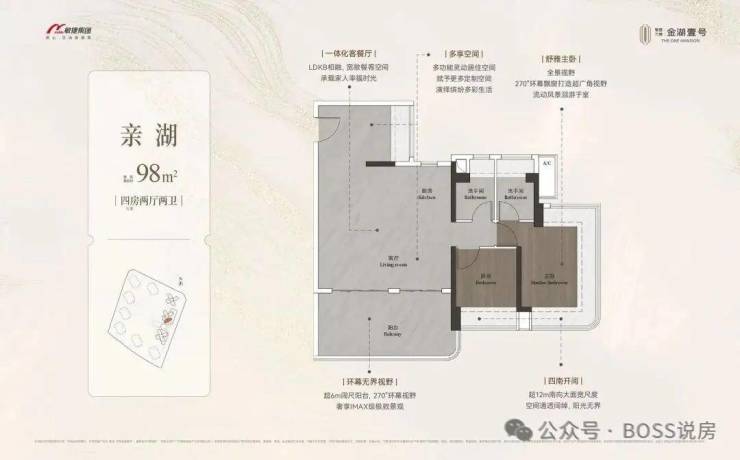 户型设计合理:主打建面约 98 - 148㎡的全南向湖居四房户型,涵盖刚需改善全需求。户型空间利用率高,如 98㎡能做 3+1 房,且注重空间布局的合理性和舒适度,搭配大面宽阳台、全景飘窗,采光通风效果好。