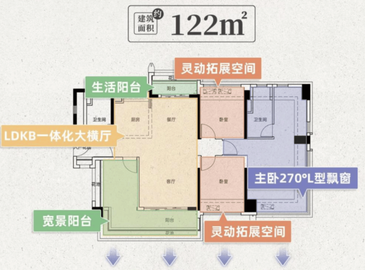 建面86平,三房两卫LDKB设计,南向景观大阳台,全屋动静分离,阳台连通次卧,约6.4米长,主卧带270度景观飘窗,总价266-310万左右。