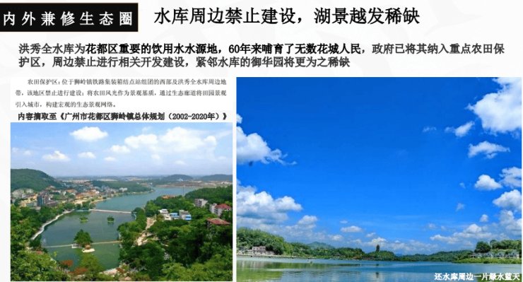 自配建以省一级标准建设的育华小学和幼儿园,周边更有花都最好的秀全中学(隔着水库相望),狮岭中学,狮峰中学,芙蓉中学等学校环绕。秀全中学,作为国家级示范高中,2021年的高考,秀全中学本科上线率就达93.8%,成绩名列花都前茅。