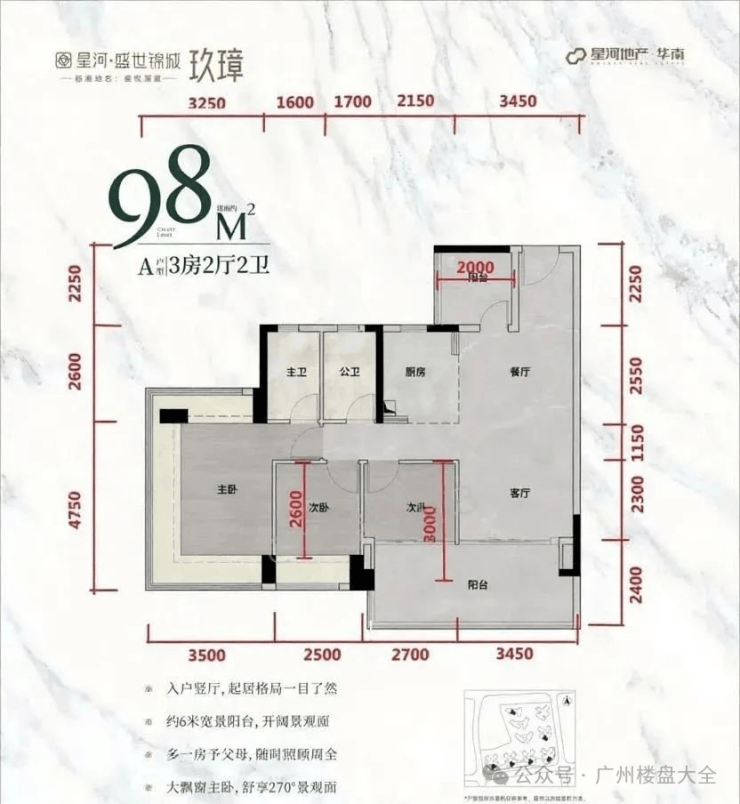98㎡户型全新升级,主朝向朝南,让阳光洒满每一个角落。主卧配备 270° 无柱飘窗,视野开阔,美景尽收。次卧和阳台尺度大幅增加,提供更加舒适的居住体验,无论是休闲娱乐还是晾晒衣物都更加从容。