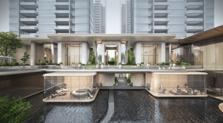 天奕关于社交空间设计的巧妙在于,不仅有纯粹的室内空间和景观组团会为社区内的社交预留空间,还会依托下沉会所天然的垂直视觉空间,预留出半开敞式的城市会客厅,融入自然景观之中。