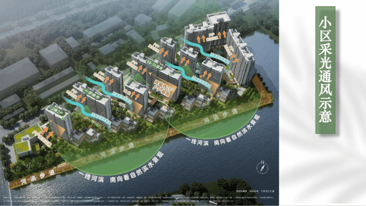 由于临近军区的原因,所以朝向不是正南,而是偏西南,小区设计南低北高,东侧的临河位置由于限高15米,做了5栋4层高叠墅,西侧也是小高层15-16层设计。