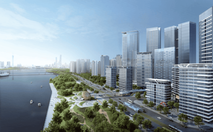 项目一线临江,搭配现代商务全玻璃幕墙,南高北低,最大程度展现一线江景。