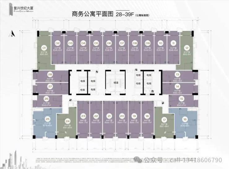 公寓8梯28户,办公6梯15户,商业4梯34户