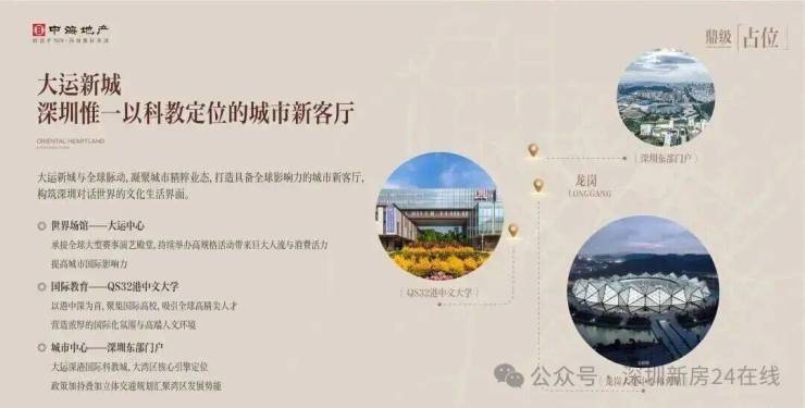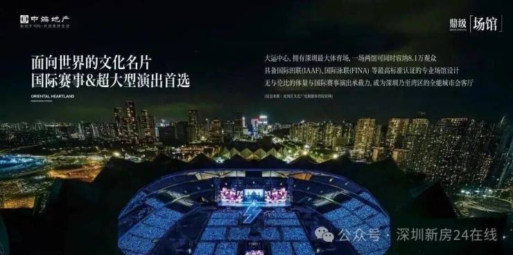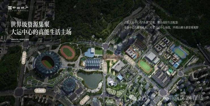 大运中心拥有深圳最大体育场,一场两馆可同时容纳约8.1万观众,具备国际田联(IAAF)、国际泳联(FINA)等最高标准认证的专业场馆设计,是国际赛事与超大型演出的首选。项目头排对望大运中心,,近享家门口的世界盛会。(信息来源:龙岗区文化广电旅游体育局官网)