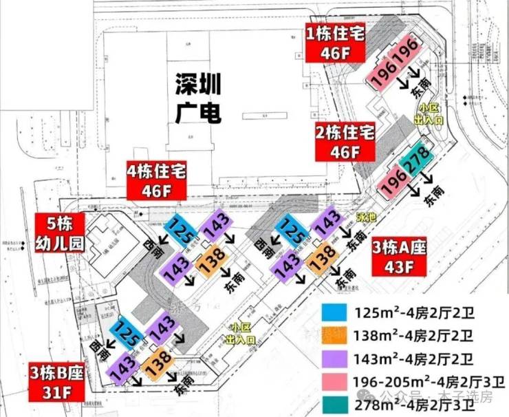根据最新披露的总平图,大运玖章花园规划建设五栋高层及超高层住宅。分别为1-4栋,3栋又分为A、B两座。整个项目由于被分为两个不规则的小地块。基于地块形状,大运玖章花园将1栋、2栋分布在较小的北地块,并且都是46层的超高层,户数则是一层两户。