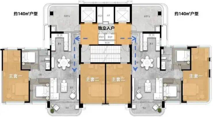 140㎡户型:2梯2户专梯入户的纯板楼设计,双主套三卫保证每位家庭成员的居住舒适度,长辈房朝南还近门口,两代人住一起互不打扰,各自拥有绝佳私密性。