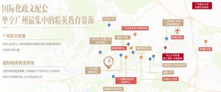 教育——项目3公里范围内集聚市二中、爱莎国际学校、贝赛思国际学校、华南师范大学附属黄埔实验学校(南校区)、美国人学校等多所国际院校,营造双语教学环境,培育与国际接轨的菁英人才;
