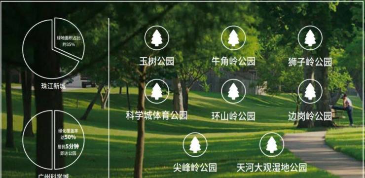休闲——3公里范围内汇聚了8大公园,城市生态环境优美,将打造广州最舒适的低密生态CBD,举步即享鲜氧绿意;