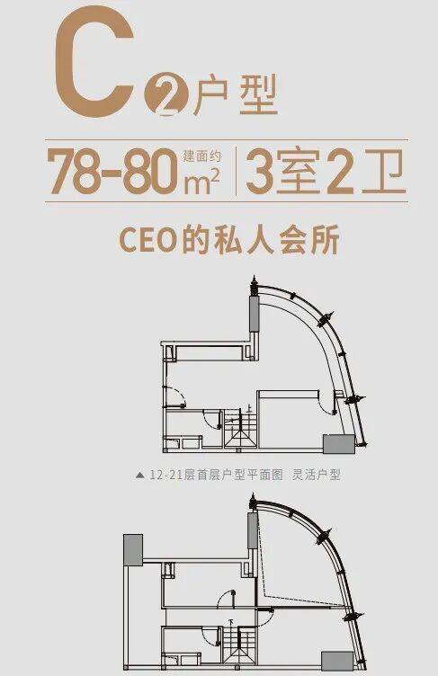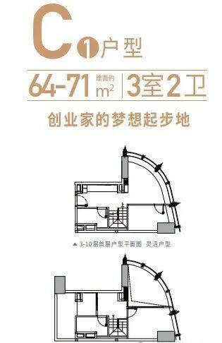 产品类型:48-115㎡复式(1-5房)C塔的loft产品6梯24户;107-350m²平层