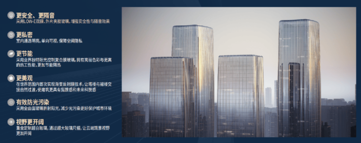•阳光控制复合膜+Low-e双膜玻璃,具有亮丽的色彩和优越的隔热降噪等性能
