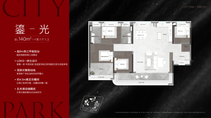 该栋为25层高,两梯三户设计,只有两个面积段,120㎡和140㎡,户型做得不错,在景观展现上用了功,极大程度去放大观江面,比方说超宽阳台、L型主卧转角飘窗、客厅预留观景飘窗等等,主打改善户型,2025年9月整体交房。