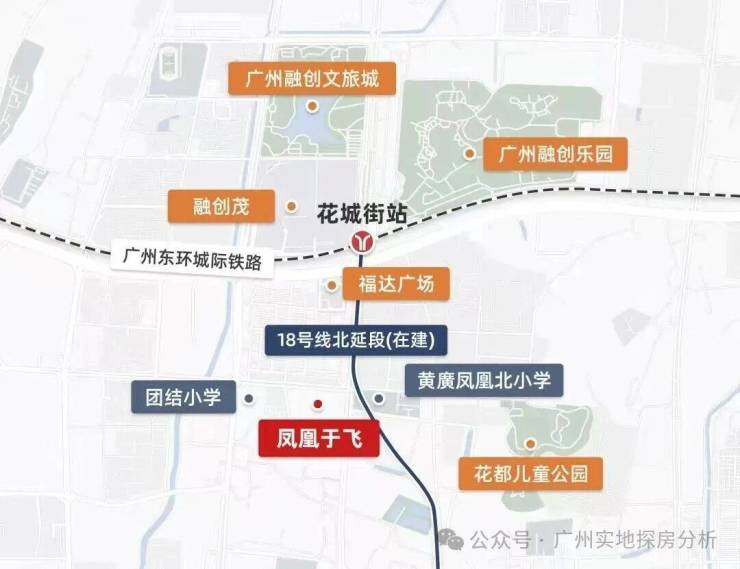 项目距离地铁18号线和穗莞深城际花城街站直线距离仅约800米,4个站到白云新城,8个站到珠江新城。