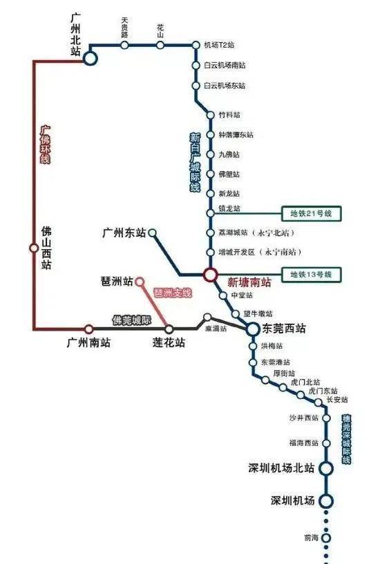 新白广城轨(在建中)1站白云机场,南向通达东莞和深圳。