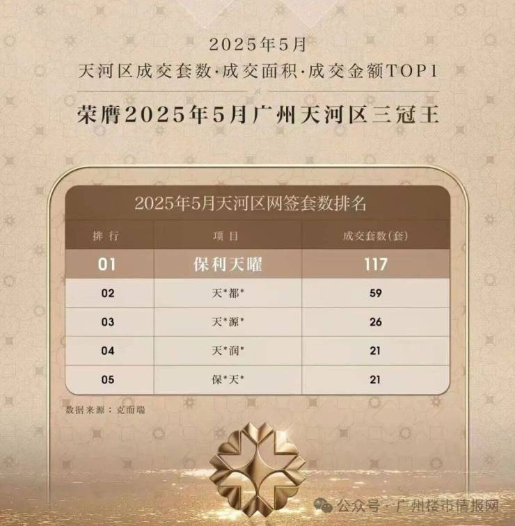 2025年5月17日,保利天曜正式开盘,推出120、140、170、210平方米产品,价格8.8万~11.8万元/平方米。网签117套,成为5月天河新房排行榜销量冠军。