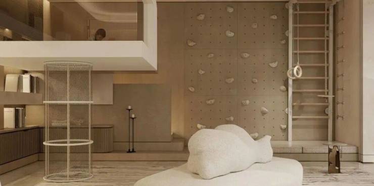 2F-起居栖心:双套房设置·步入式衣帽间行政套房·6.6米奢阔观景台;MF-娱乐空间:超5米挑高空间·定制亲子攀岩墙·跨界收藏空间;
