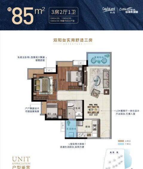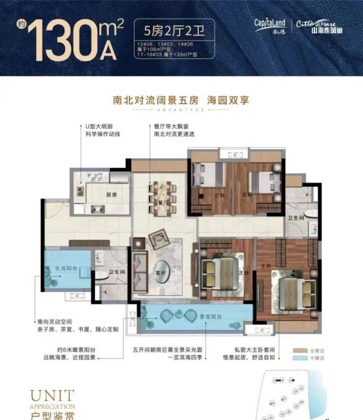项目一共有5个面积段,分别是85平三房两厅一卫,91/106平三房两厅两卫,130平A户型五房两厅两卫,130平B和135平户型四房两厅两卫。