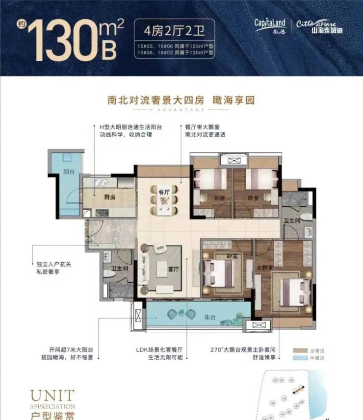 以下叠为例,室内一层自带入户花园和超大观景阳台,厨房还连通生活阳台,大大提升了便利性;