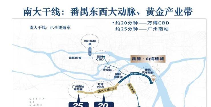 好处是项目自驾还算方便,目前南大干线已经全线开通,去往南站、万博、大学城、创新湾等地都很快,比如去往琶洲,仅仅26分钟的车程时间