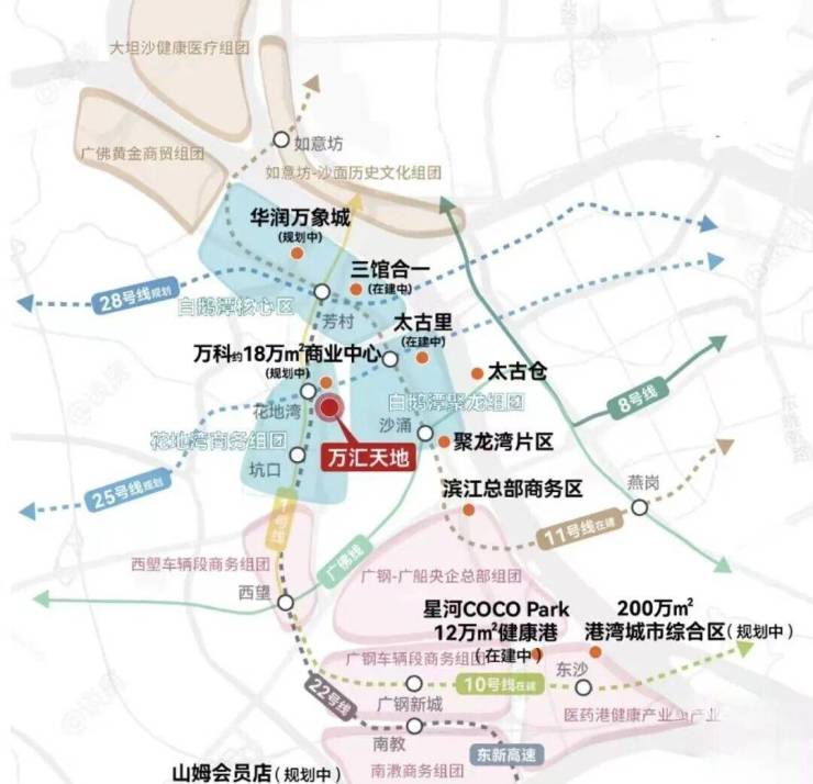 此外花地湾片区基本都是由万科统一开发,汇合白鹅潭-花地湾-聚龙组团的板块张力,白鹅潭核心区、聚龙组团、花地湾组团,于半径约2KM内构建珠江西岸CAZ黄金三极。
