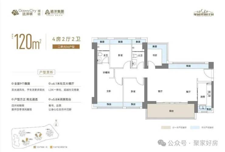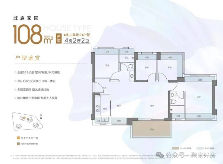 108㎡的4房2厅2卫,西南或东南向,横厅南北通透格局,进门独立玄关,客餐厅6.1米开间,主卧双飘窗通透设计,全屋10个凸窗,飘窗+阳台使用率在90%左右。
