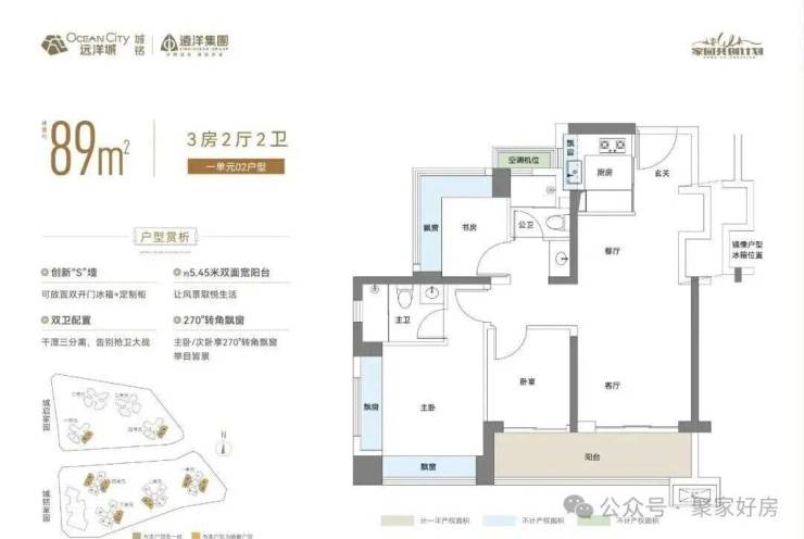 东南或西南朝向,竖厅设计,客厅有预留冰箱位,客厅,主卧,次卧分别朝南,户型一共有8个飘窗,加上阳台和飘窗使用率在90%左右。