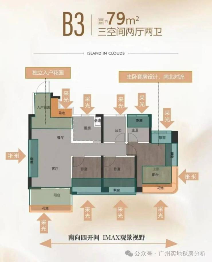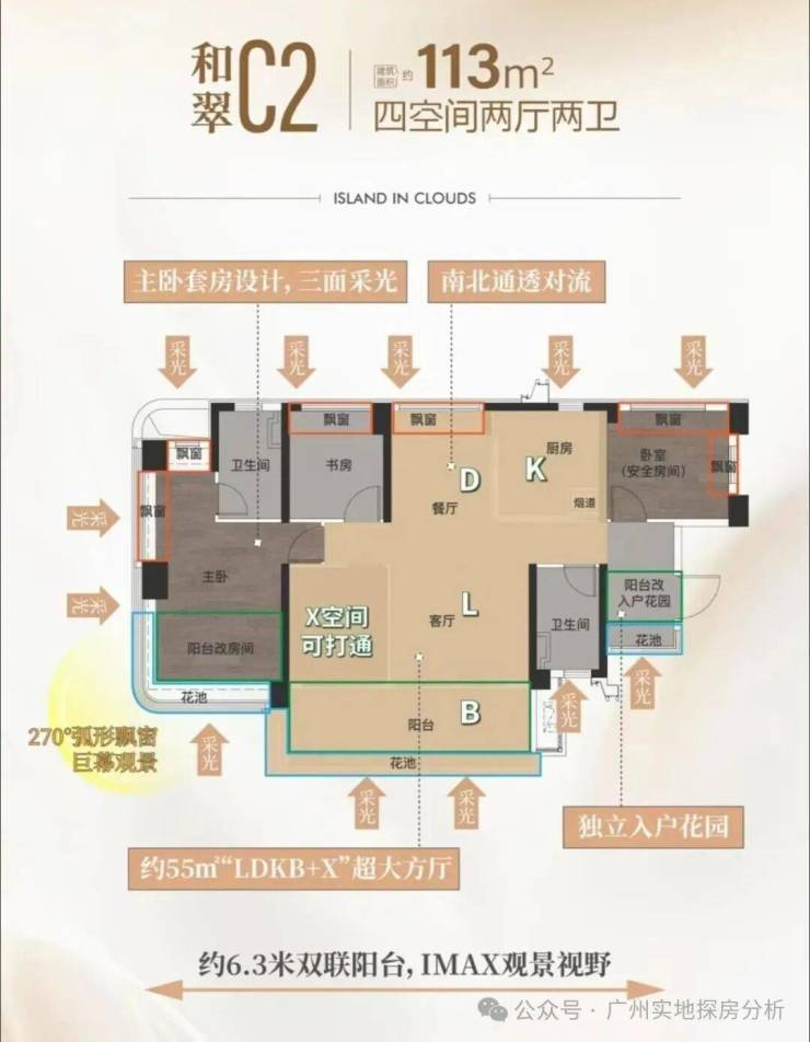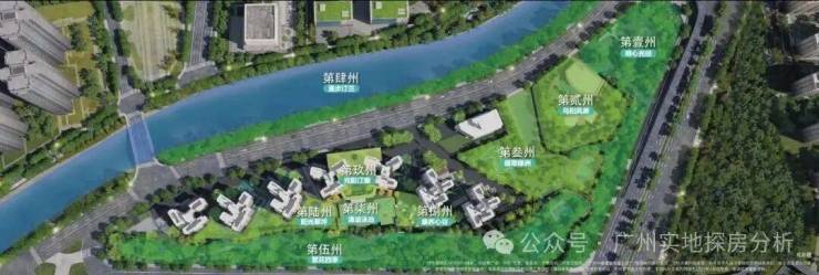 项目以6.7万方的大盘缔造了城市绿肺,而且它全部都是一字形排布,实现了全南向看江视野,将海珠的后航道、广州塔、海珠湿地公园等等景观尽收眼底。项目还斥资5个亿啊,打造了7.2万方的内外双园。
