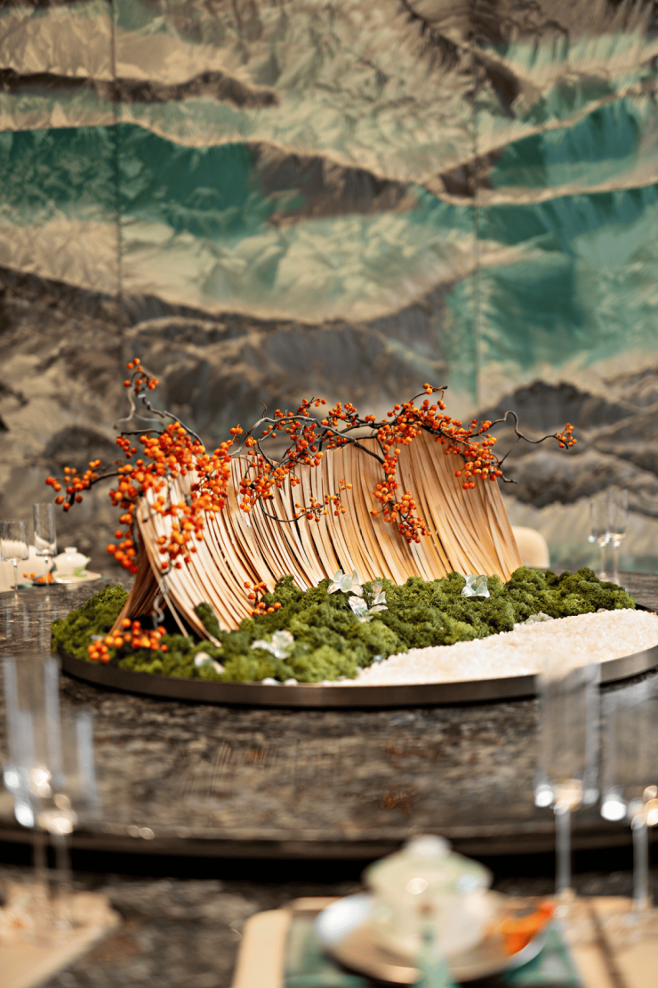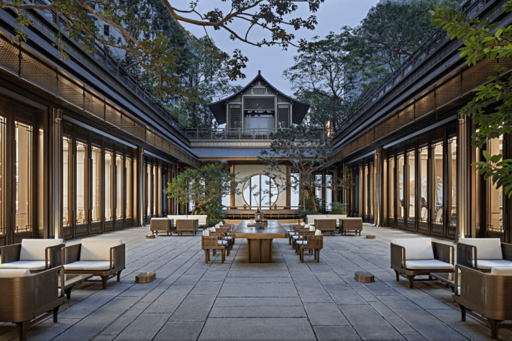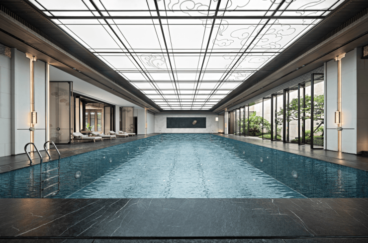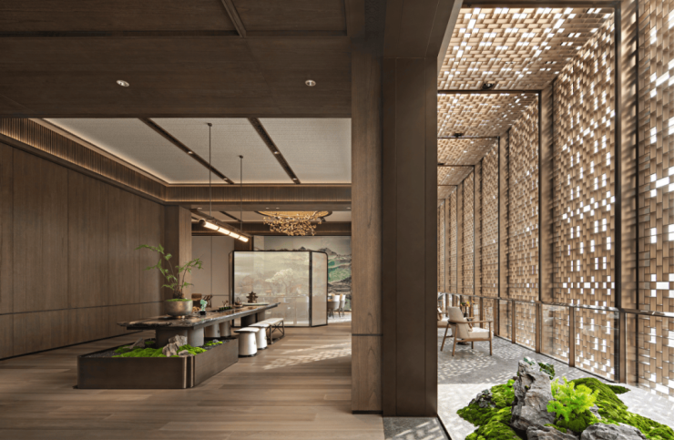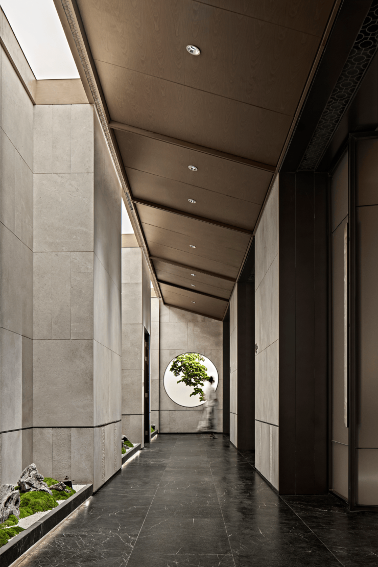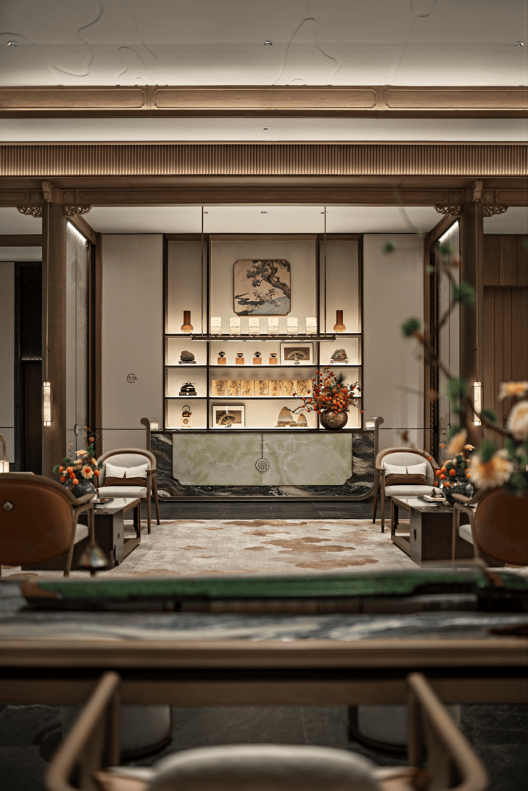 这是继深圳盘石设计为保利创新研发的首个天字系中式府邸「广州保利天瑞营销中心」后,再度打造的极富东方美学造诣作品——「瑞庭雅集」下沉式庭院会所。