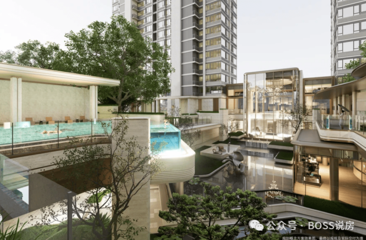 酒店式会所:引入板块首个酒店式会所,采用大面积玻璃幕墙设计。会所内规划有品质会客区、健身休闲区、雅致休憩区、游泳池等功能空间,为业主提供专属的高端休闲场所。