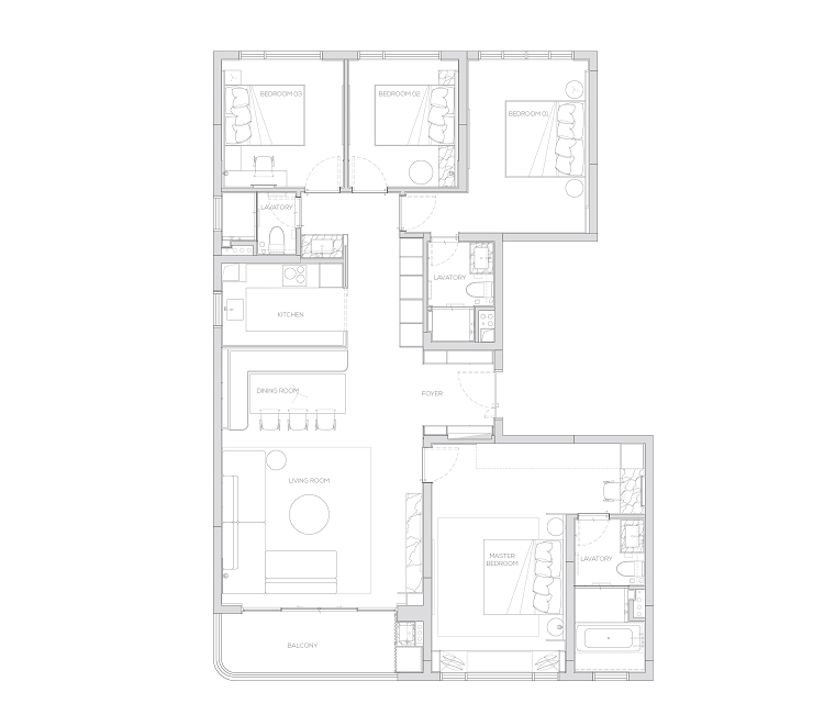 174产品为四房两厅三卫产品,打造了端户边厅布局,形成LDK一体化。无界的室内空间畅游体验,在平淡的日常里体验着生活的华章。
