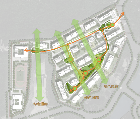 出入口正对中央景观,东南侧则设置次要出入口与幼儿园出入口,以不同的高度差分隔各个流线,使其不会相互交错,造成交通组织混乱。
