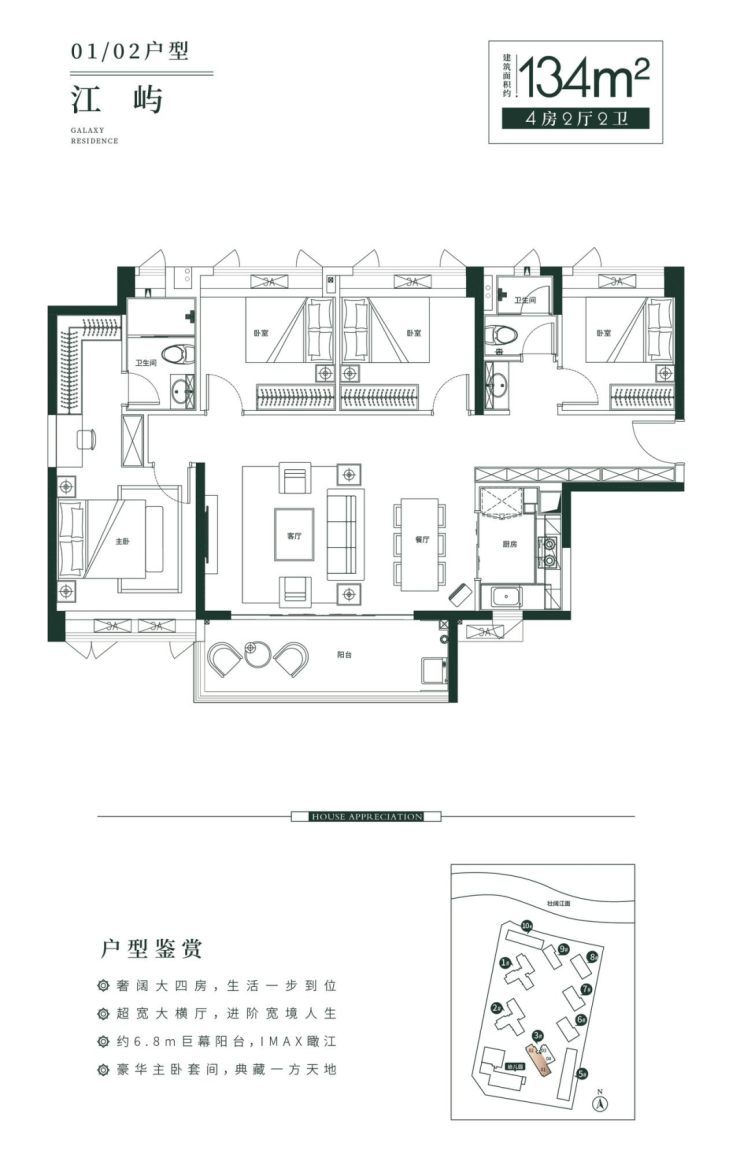 (2) 建面约134平四房两厅两卫户型。