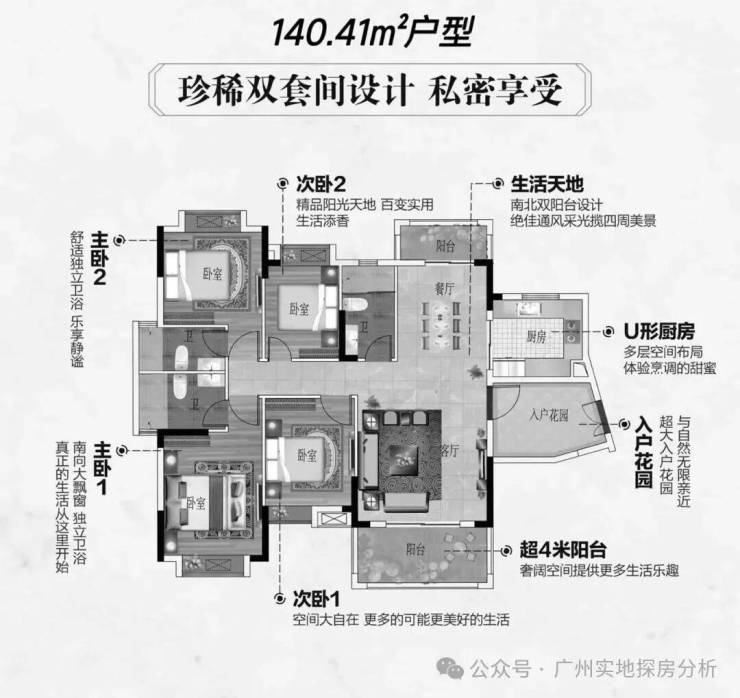 洋房全明格局,80-88㎡南向两房带入户花园,139㎡四房双套间;