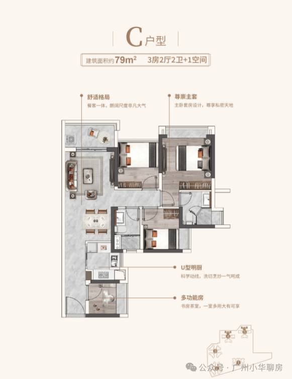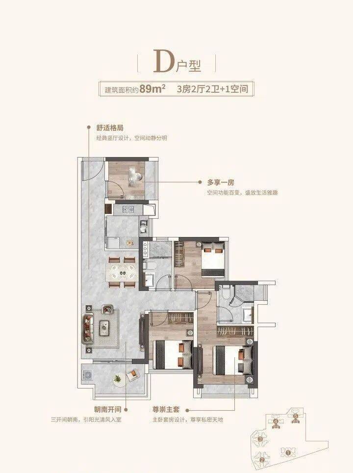 2、户型设计比较好,使用率高,主打相同面积多一个房间,比如87可以做四房,空间感很强。