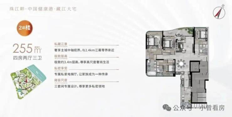 建筑采用现代极简美学,香槟金色水波纹立面搭配大面积玻璃幕墙,倒映珠江波澜,勾勒白鹅潭标志性天际线。社区以 “一江三园” 为脉络,打造 35% 高绿化率立体园林,与滨江绿道无缝衔接;配建约 3000㎡星环会所,内含恒温泳池、健身房、私宴厅等全维高端社交空间,车位比高达 1:2.77,匹配顶豪居住尺度。主力户型为 139-335㎡三至五房,3.4 米奢阔层高,LDKB 一体化通透布局,四开间望江。其中 255-285㎡头排江景四房,配 270° 环幕阳台与巨幕客厅;335㎡五房楼王,主卧套房带双台盆、独立衣帽间与江景浴缸,每一寸空间皆为城市塔尖定制。