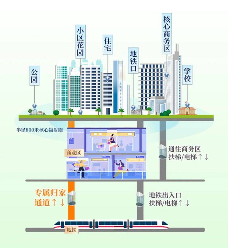 在TOD蓝图里,地铁上盖不仅仅是建筑,更是一个强大的“资源接口”。通过地下空间、地铁专属归家通道的巧妙设计,将商业、办公、居住、文化、教育等功能进行“芯片级”的整合,实现生活场景的高效链接。