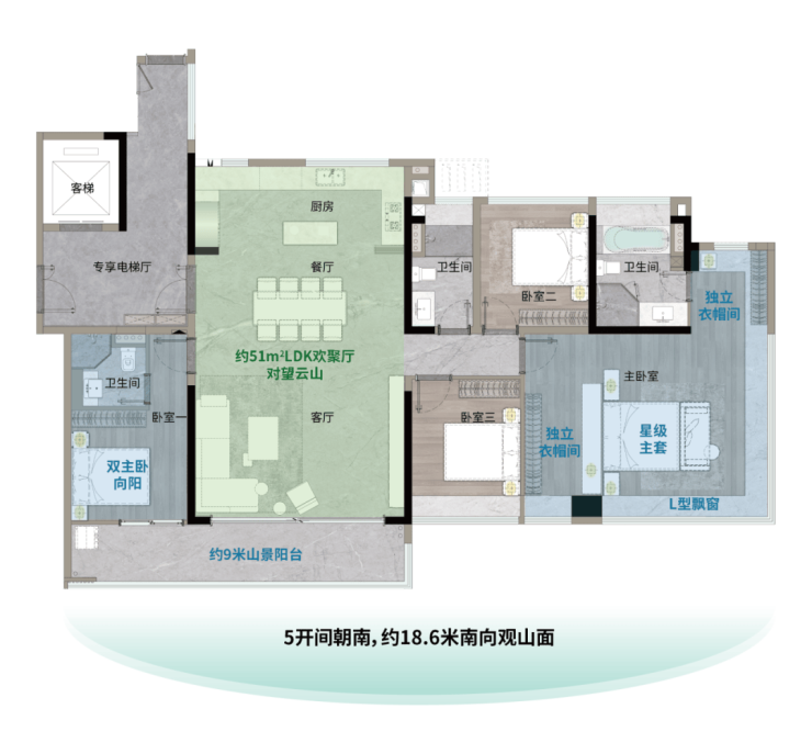 奢享约18.5米总开间,五开间向阳。约50㎡LDK一体化空间,搭配中西双厨,尽显风范;星级主套房配备双独立衣帽间及270°全景飘窗,尽览云山盛景,是追求多代同堂和乐生活的塔尖家庭优选。