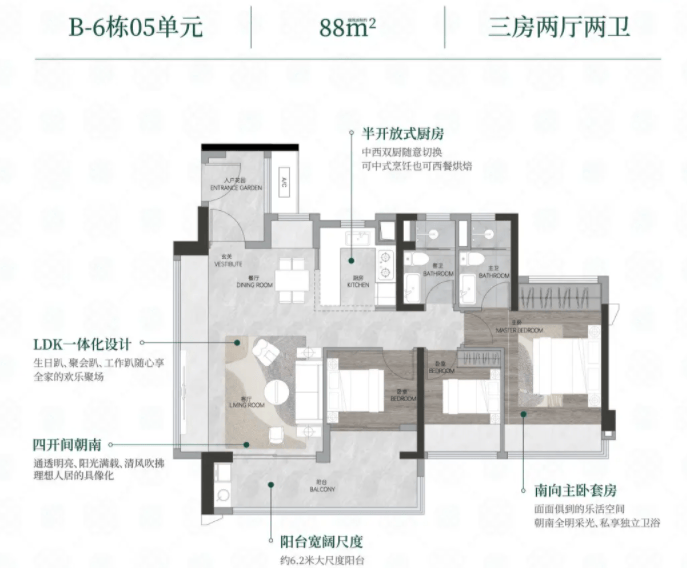 6.8米的宽景阳台既能晒衣服又能摆茶桌,双主卧设计还能照顾老人的隐私。