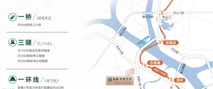 建鑫如意芳华扎在白鹅潭核心区,离在建的地铁11号线石围塘站只有600米,这条大环线贯通天河、琶洲