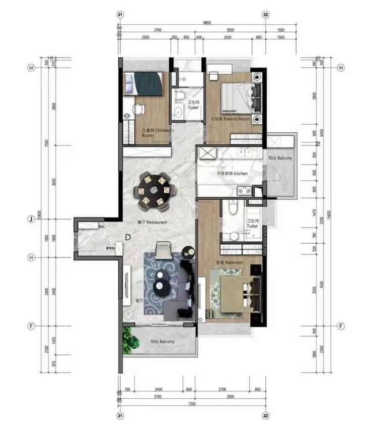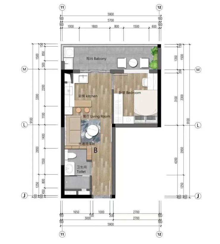 该户型偏向于公寓式设计,层高3米,开放式厨房设计,约5.7米的大阳台,提升了整体的空间亮度。