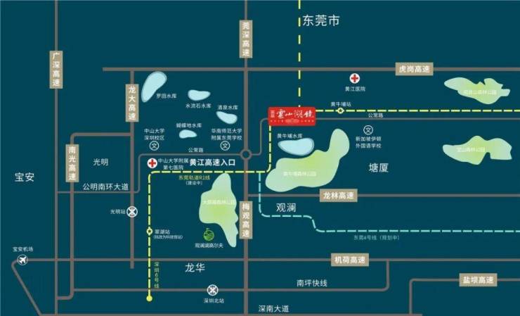 项目处于G94莞深高速黄江出口旁,周边高速路网纵横,拥有广深、莞深、外环、龙大、南光、龙林在内等多条高速公路,距离深圳梅林关仅25分钟路程(相比福永、沙井、坪山等要所花费时间要少得多,而房价只有以上地区的一半),距离东莞市区仅40分钟路程,交通便利。项目无缝衔接东莞地铁R1、R4线,距离东莞规划R1黄牛埔站,R1、R4线双轻轨交汇站黄江中心站均为5分钟路程。未来将与深圳6号线、广州5号线对接,此外,广深港高铁中心(光明城站)近在咫尺,未来将成为深圳西北交通门户,近距离享受畅达珠三角的便捷轨道交通