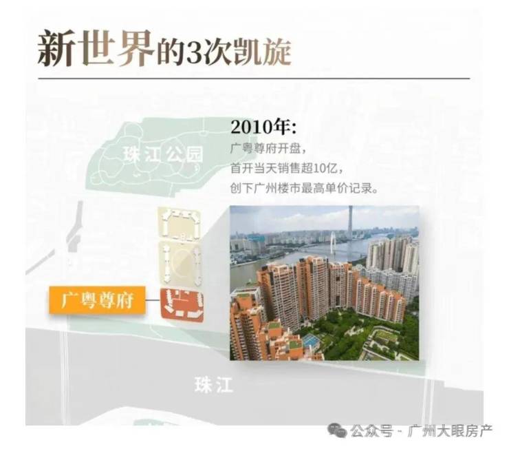 2010年,凯旋新世界广粤尊府首开,当天销售超10亿,一举创下广州楼市的最高单价记录。也正是这一年,广州楼价达到历史巅峰,涨幅为38%。