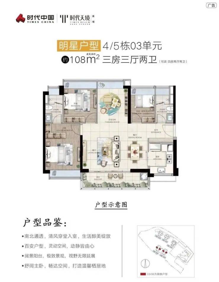时代天境(黄埔)占地约4.5万㎡,总建面约18万㎡,由2栋高层、3栋超高层,共5栋楼组成,合计1140户,车位比1.2,产品面积户型为80㎡-108㎡三至四房,项目配套24班小学,背靠创新公园的山体资源。