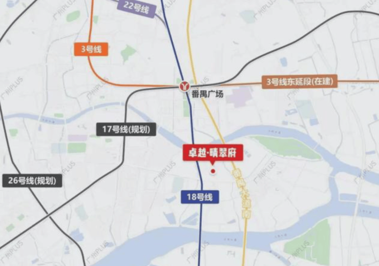 地铁距离番禺广场站直线距离2公里,有3号线、18号线、22号线交汇,可以贯穿全城。另有规划的17号线桥南站将进一步提升交通便利性。