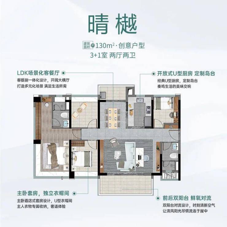 建筑面积约130㎡, 3+1室两厅两卫,主卧配套衣帽间,开放式明厨,酒店式主卧套房,270度飘窗。