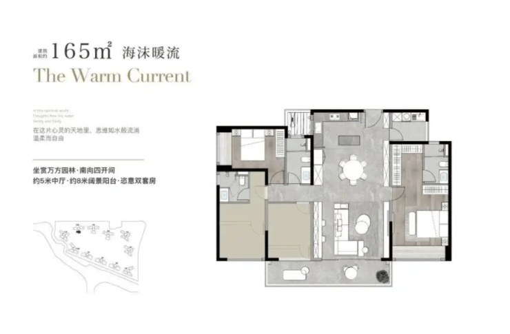 目前在售的都是四房户型,覆盖140㎡、165㎡和200㎡三个面积段,全部在东区的3栋住宅里,现房能直接进房看空间布局。