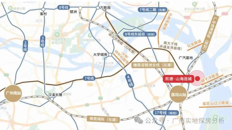 项目交通配套:自驾有利丰大道、南大干线、广台高速等干线。周边规划的8号线东延段莲花站3.9公里,开至万胜围的线路,预计要27年试运营。家门口有个公交总站,其中番131、番77路、86巴士已经运行,去到新造地铁站也挺方便。