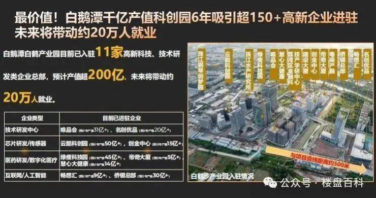 企业——白鹅潭白鹤产业园目前已入驻11家高新科技、技术研发类企业总部,预计产值超200亿,未来将带动约20万人就业。其中进驻的企业有唯品会(预计年产值31亿+)、云酷科创园(预计年产值50亿+)、绿瘦科技园(预计年产值45亿+)、侨银总部(预计年产值30亿+)等。